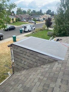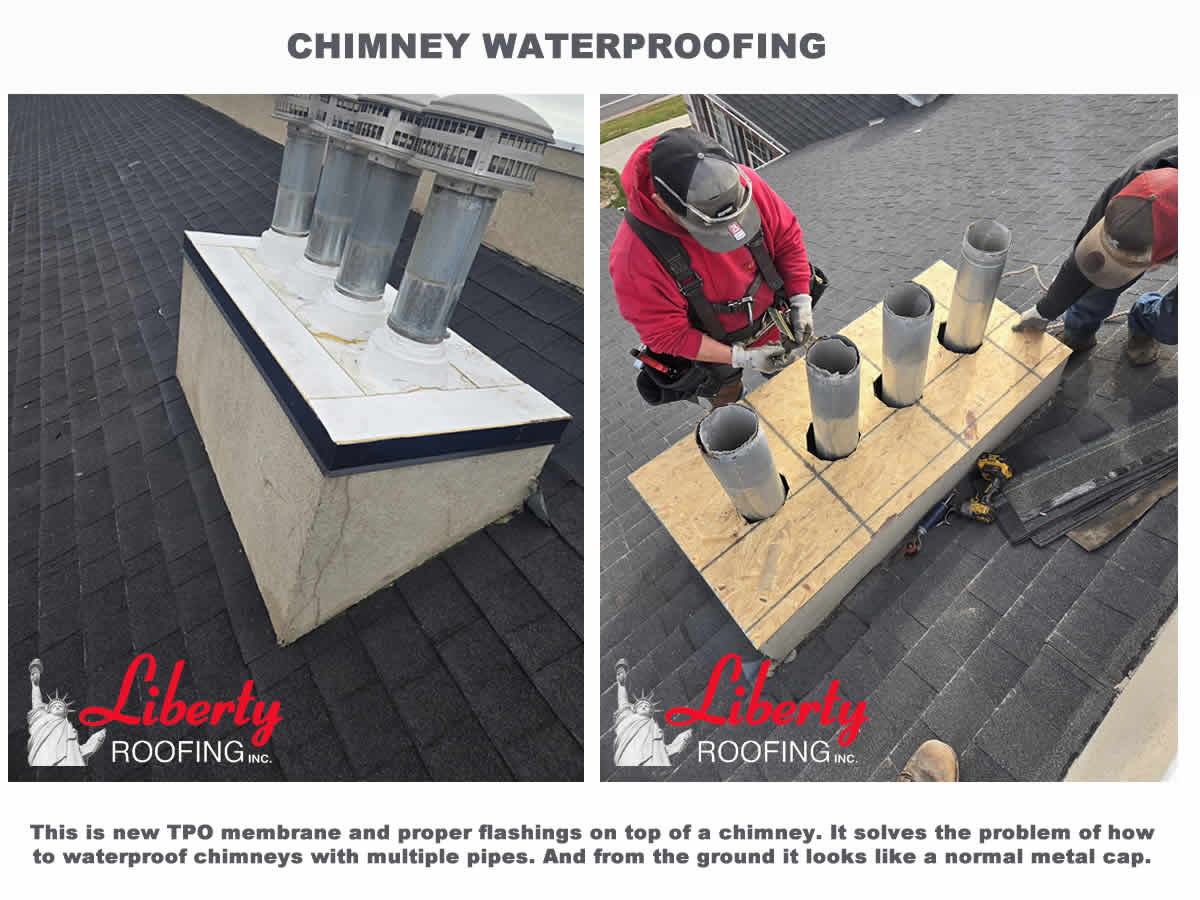 Chimney Waterproofing – This is a new TPO membrane and proper flashings on top of a chimney. It solves the problem of how to waterproof chimneys with multiple pipes. From the ground it looks like a normal metal cap.